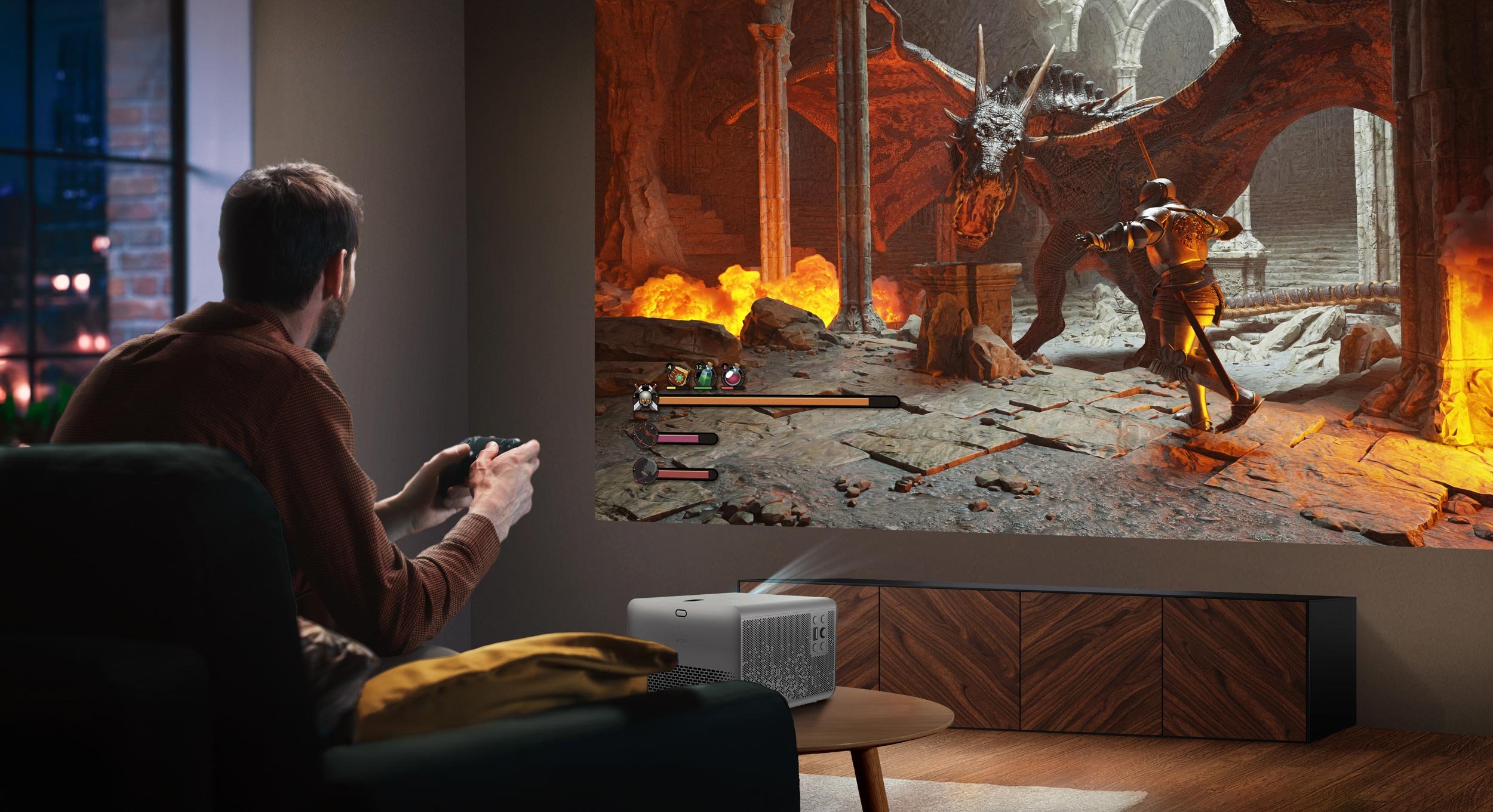 Myös puhelinohjaus, sekä nopea tulovaste pelaamiseen, optioina pöytäjalusta, sekä katto- ja seinäkiinnikkeet.