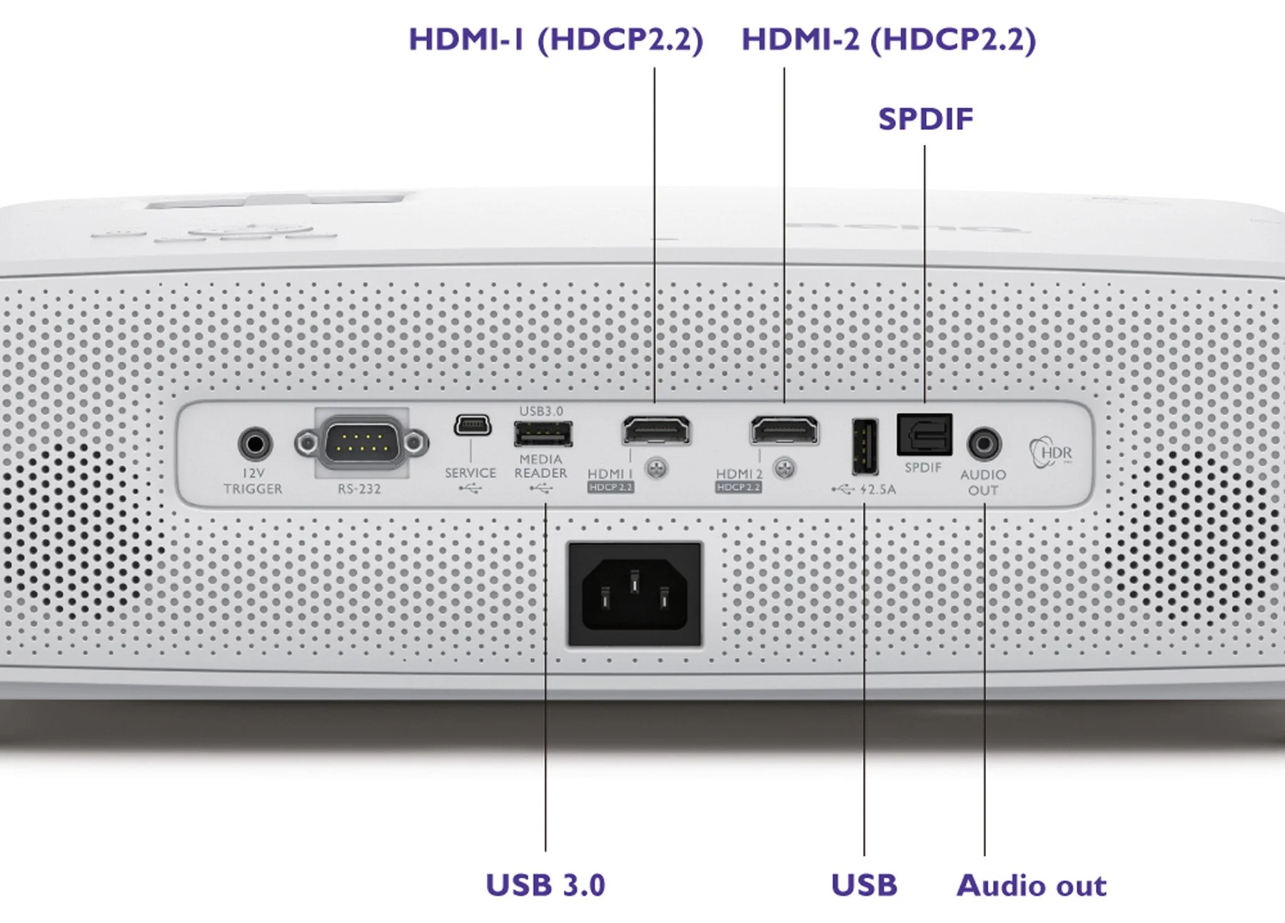 2 kpl HDMI-tuloja HDCP 2.2, ARC, 2x USB, äänilähdöt 3,5 mm ja digitaalinen, 12 V herätejännitelähtö kankaalle